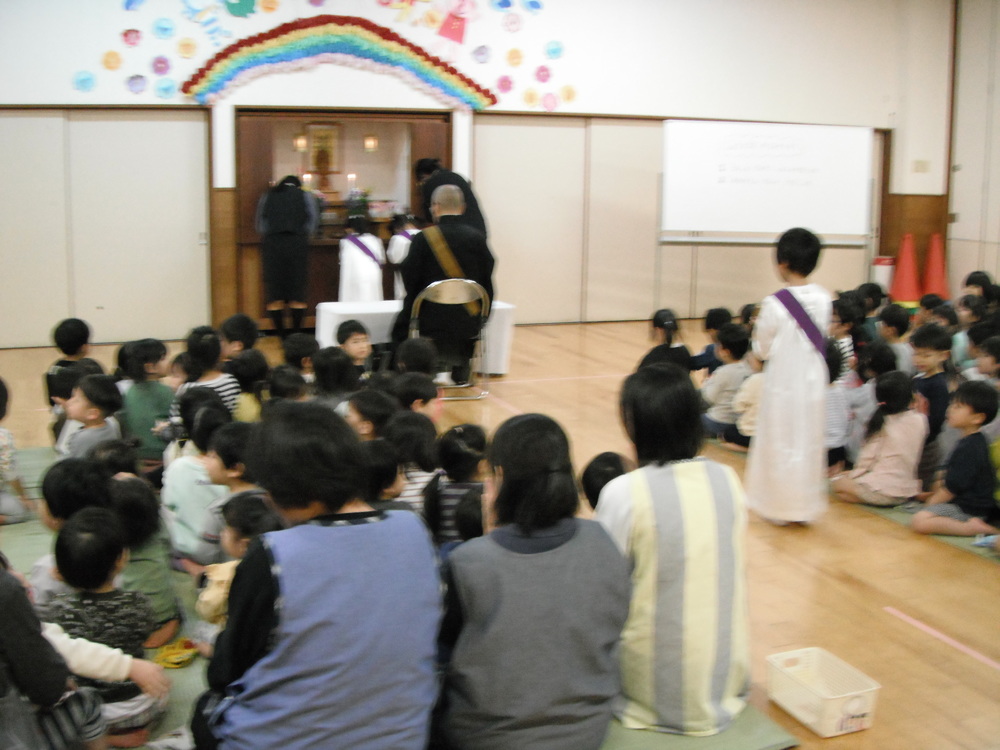 園長先生の法要とお話をしっかりと聞く子ども達です。幸せに暮らす為には、友達を好きになる事や友達に優しくする事をお話されました。